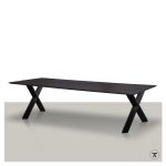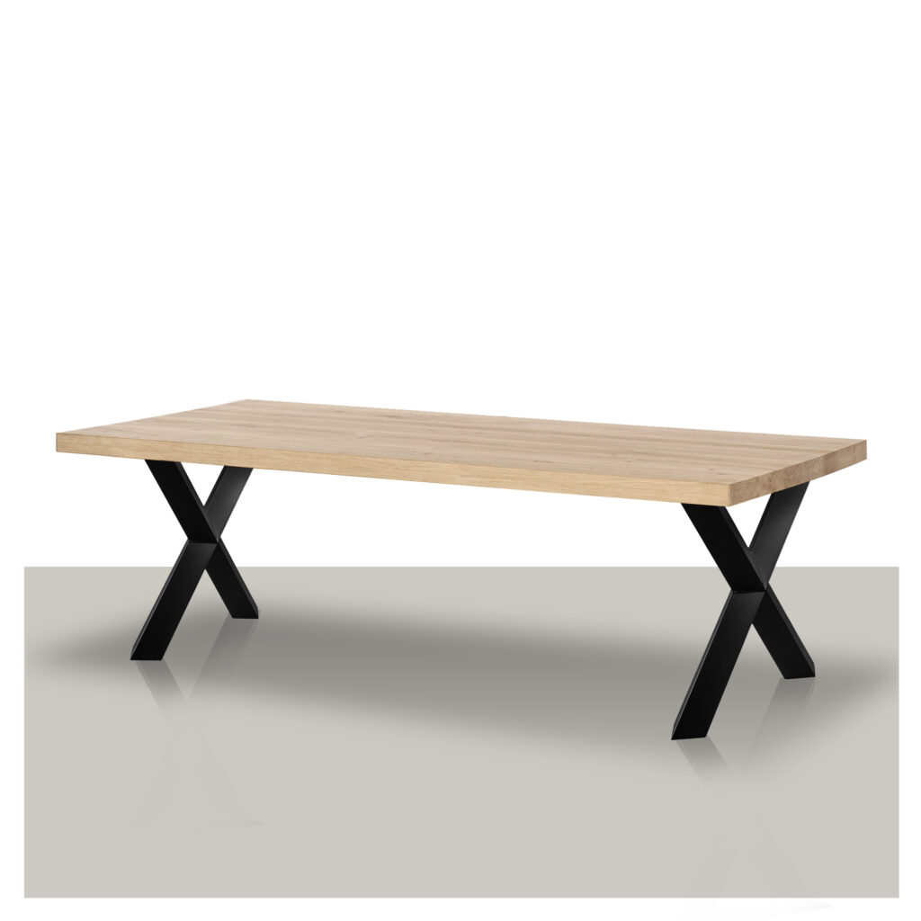Kruispoot nieuwe stijl. Door de kokers gekruist te lassen ontstaat er een spannend onderstel. Vandaar ook de naam Kriss Cross. Bij Van Tafel worden de eikenhouten tafelbladen zo behandeld dat ze zeer goed beschermd zijn tegen kringen en vlekken en ze zijn ook nog eens makkelijk te onderhouden.