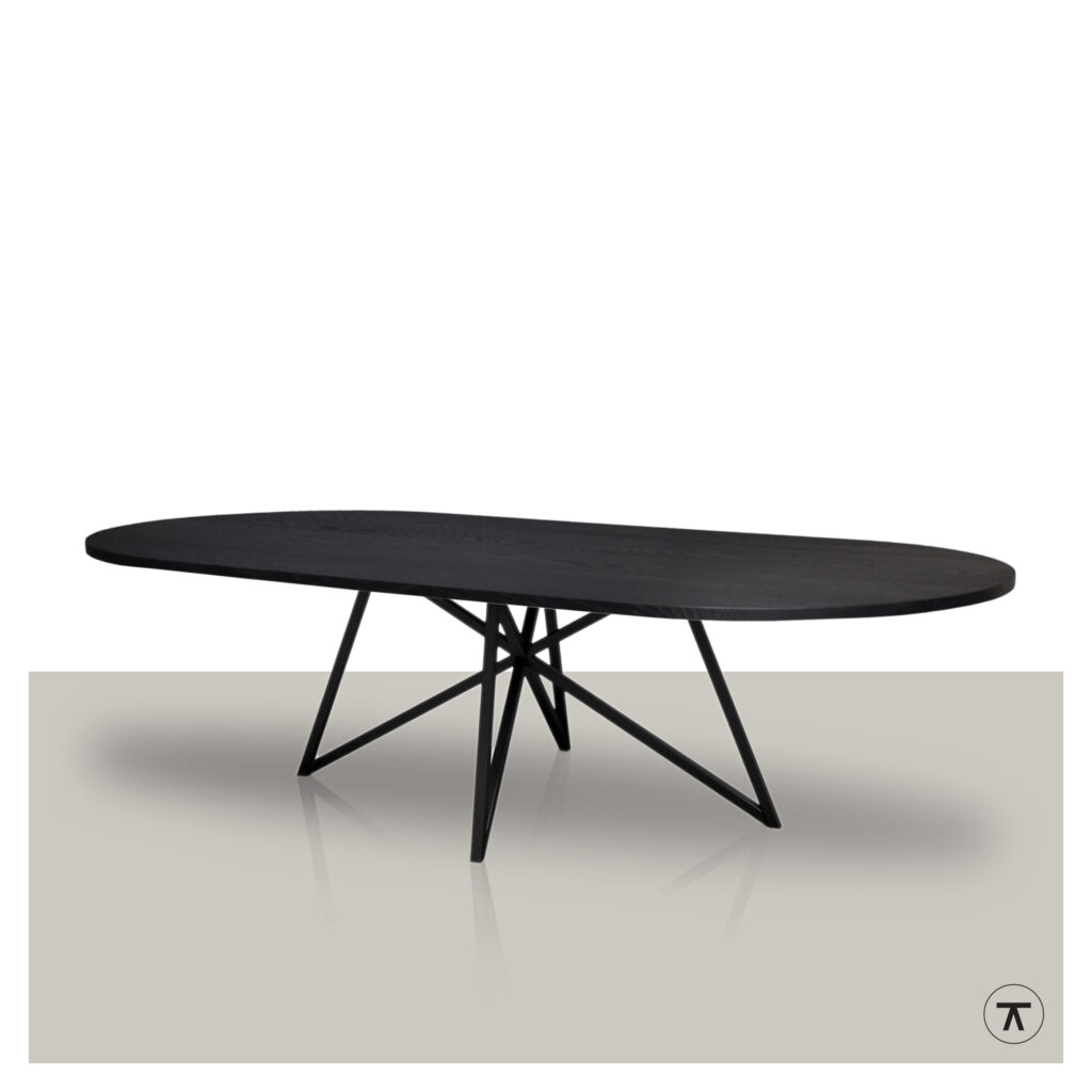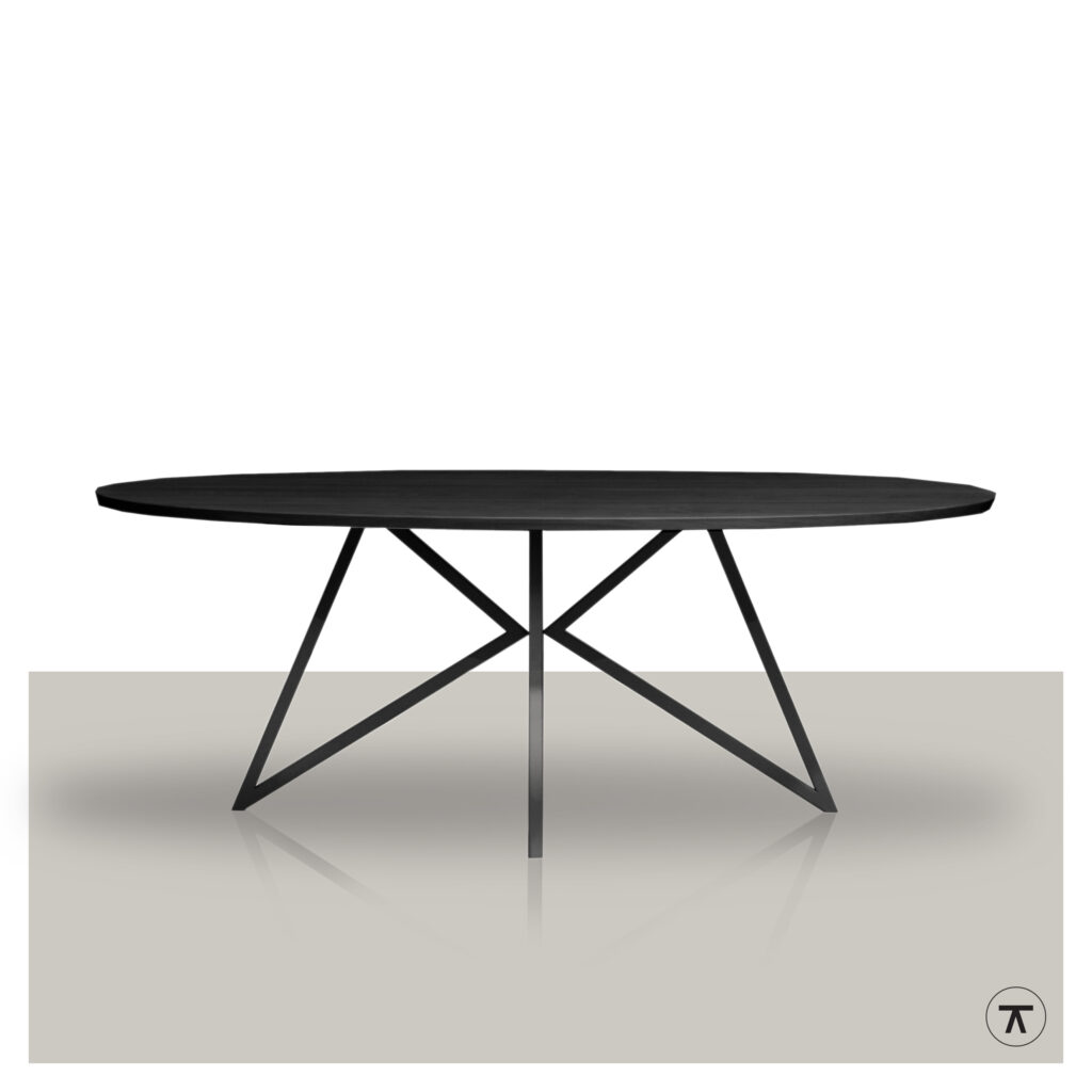 Het vlinder onderstel van de plat ovale tafel Legno is een echte eyecatcher in huis! Harmonie ten top. De kokerpoten staan perfect in balans en kunnen in iedere gewenste RAL kleur gepoedercoat worden.