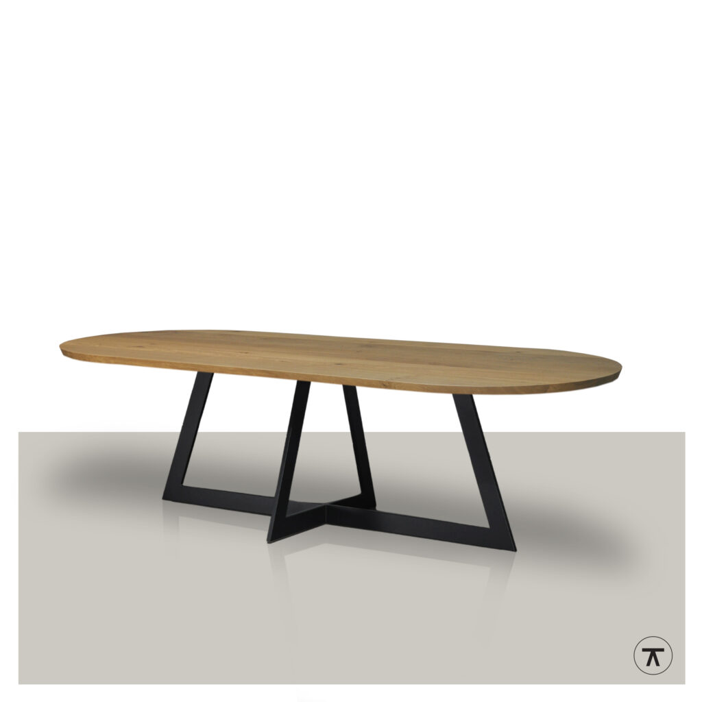 De plat ovale tafel Nabuur is een moderne eettafel met een massief eiken- of notenhouten blad. De metalen middenpoot zorgt voor een strak lijnenspel. stijlvolle en moderne uitstraling.