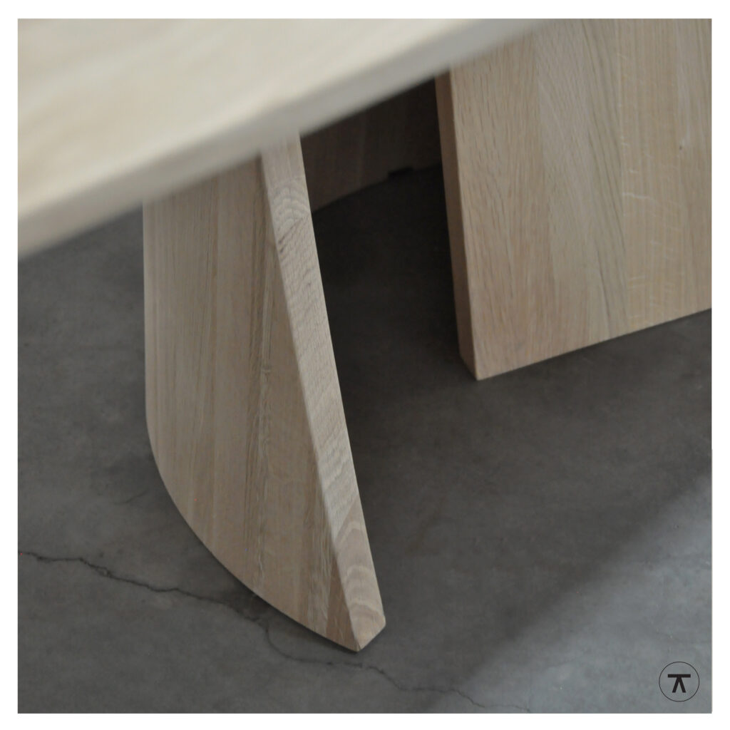 Twee golvende massief houten wangen die in de lengte in het midden van de tafel worden geplaatst zoals jij dat wil. Wij maken de volledige tafel in onze werkplaats, zodat de tafel volgens jouw wensen kan worden gemaakt. Met de plat ovale tafel Vorbis breng je design en ambacht in je interieur waarbij jij bepaalt hoe. Onderstel met de holle kant naar buiten of naar binnen, iets uit elkaar of juist niet? Jij bepaalt…